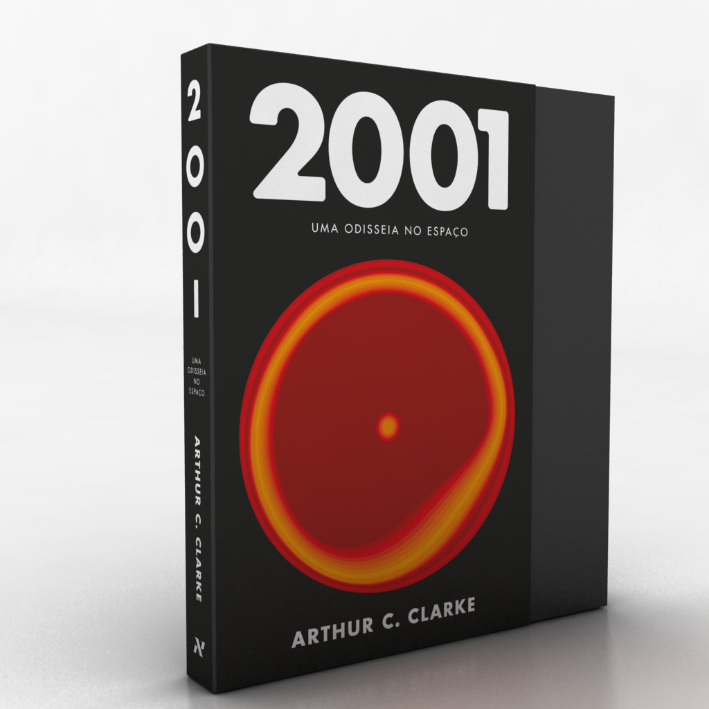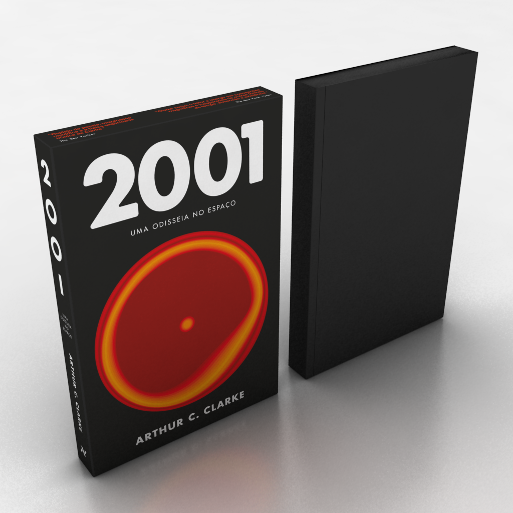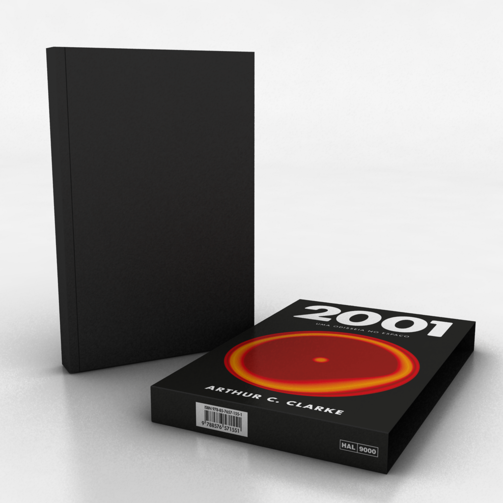 3D modeling and rendering for Arthur C. Clarke's book "2001: a space odyssey" (Cover: Pedro Inoue; Publisher: Aleph. Brazil, 2014). The book is a monolith (cover and sides all in black with no texts) which slides from a box with graphic elements.