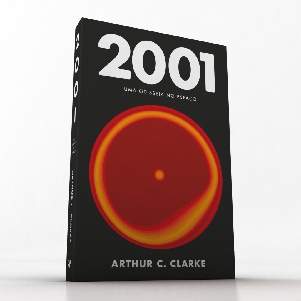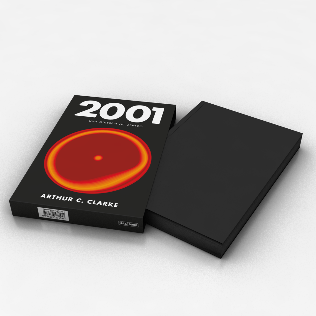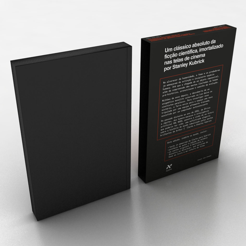 3D modeling and rendering for Arthur C. Clarke's book "2001: a space odyssey" (Cover: Pedro Inoue; Publisher: Aleph. Brazil, 2014). The book is a monolith (cover and sides all in black with no texts) which slides from a box with graphic elements.