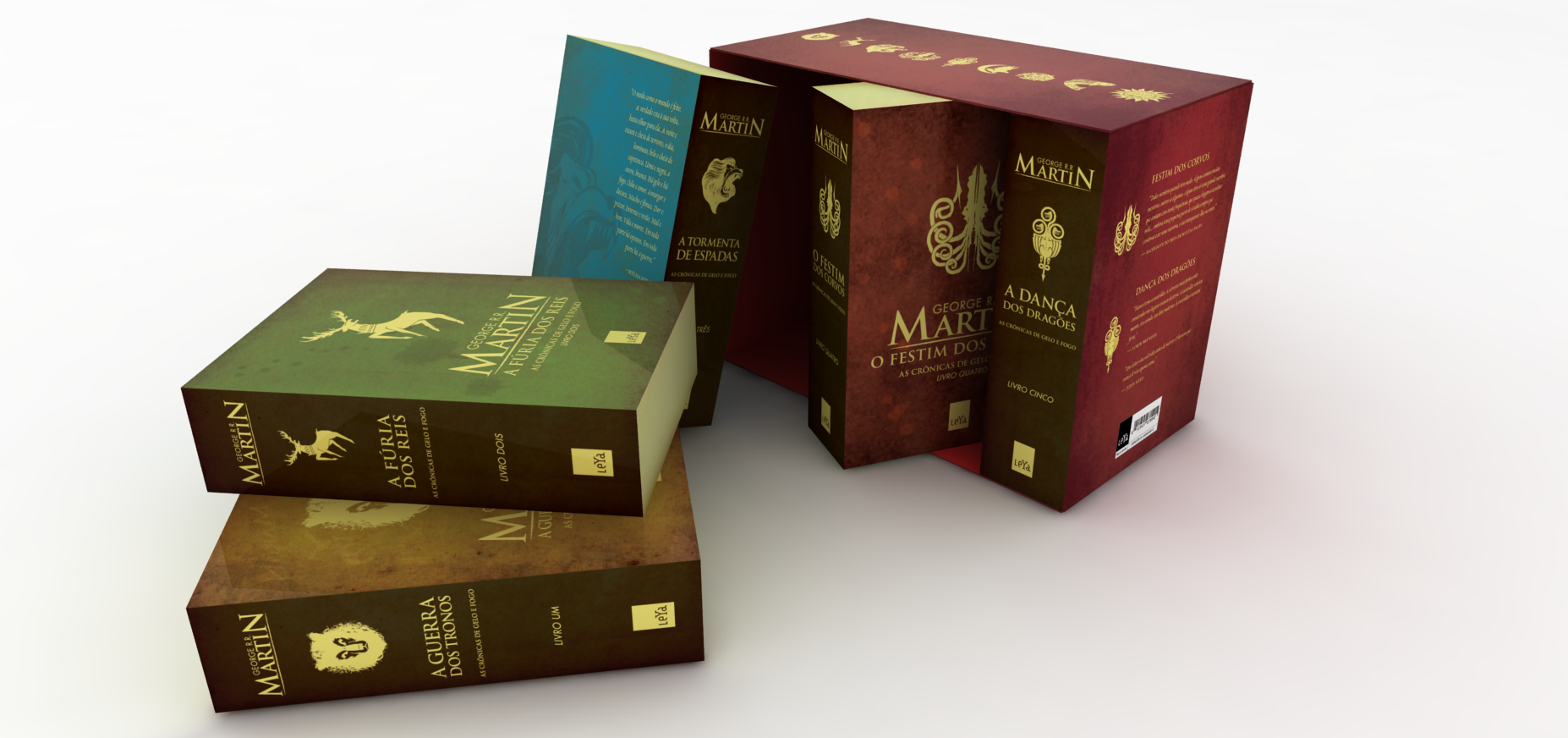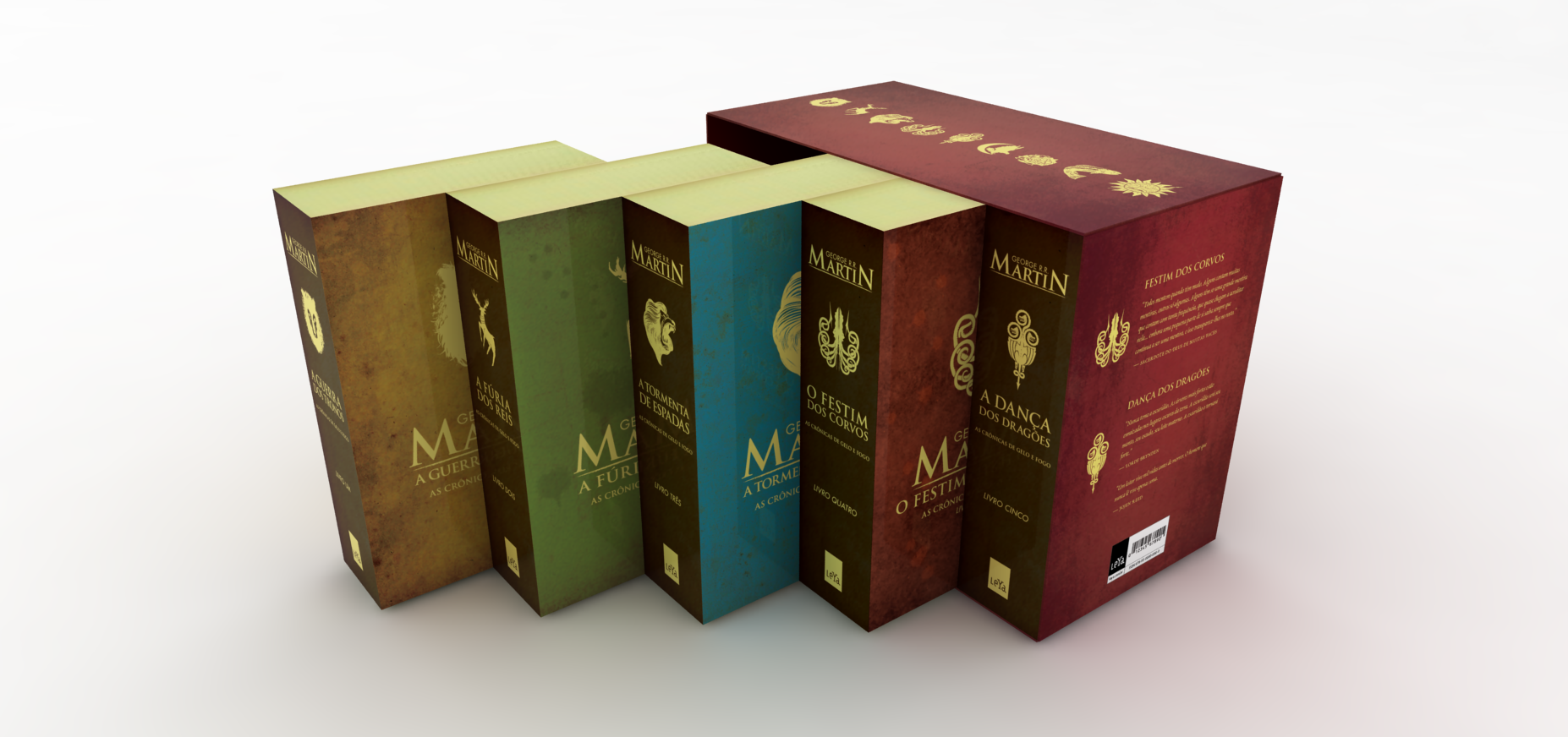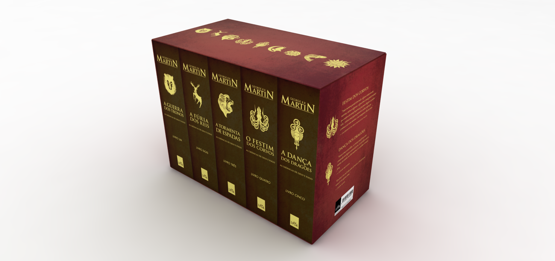 Collector's Box (1st version) with 5 pocket books of the Brazilian edition of "A song of ice and fire", from George R. R. Martin. Graphic design, 3D modeling and rendering. Illustration of the coat of arms: Guilherme Marques.