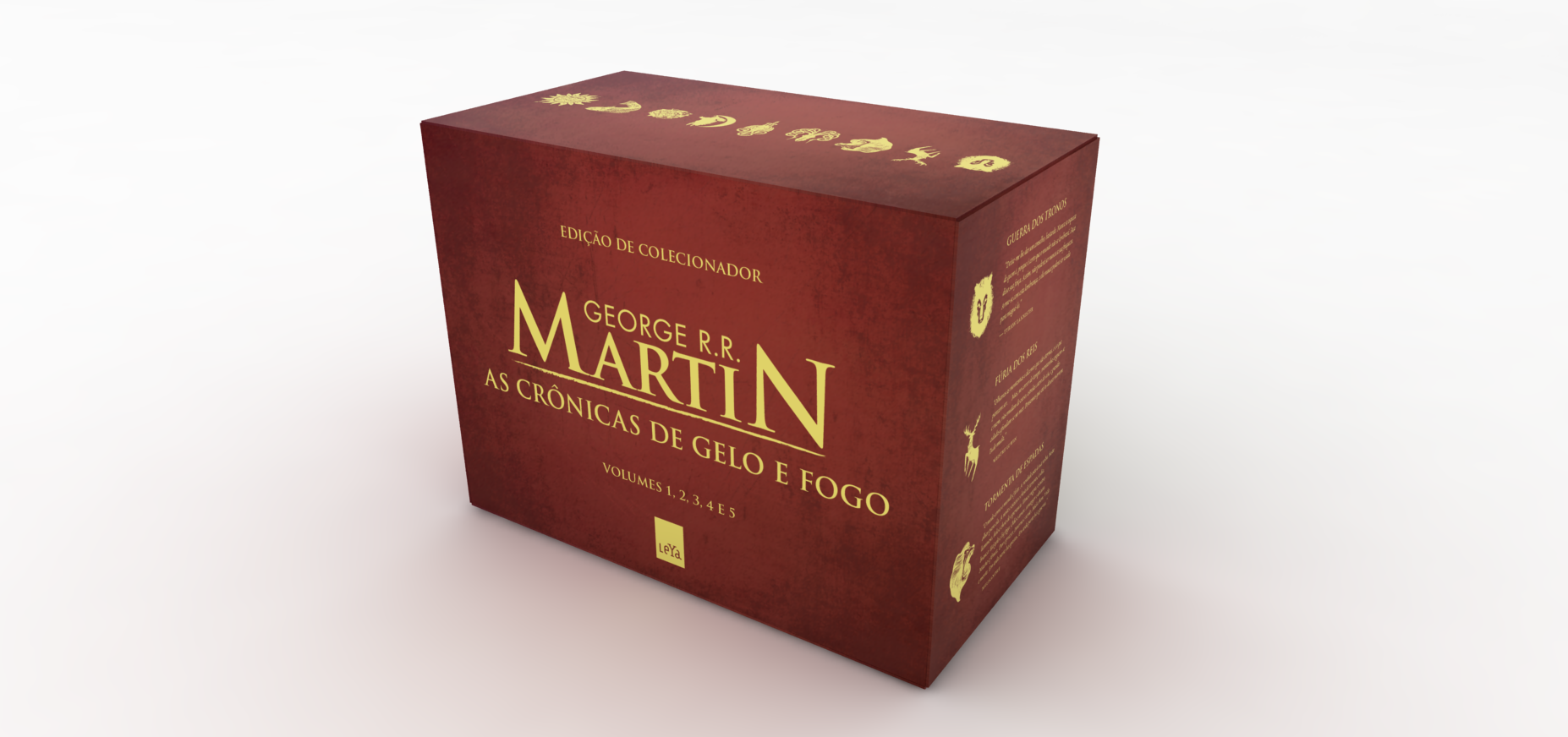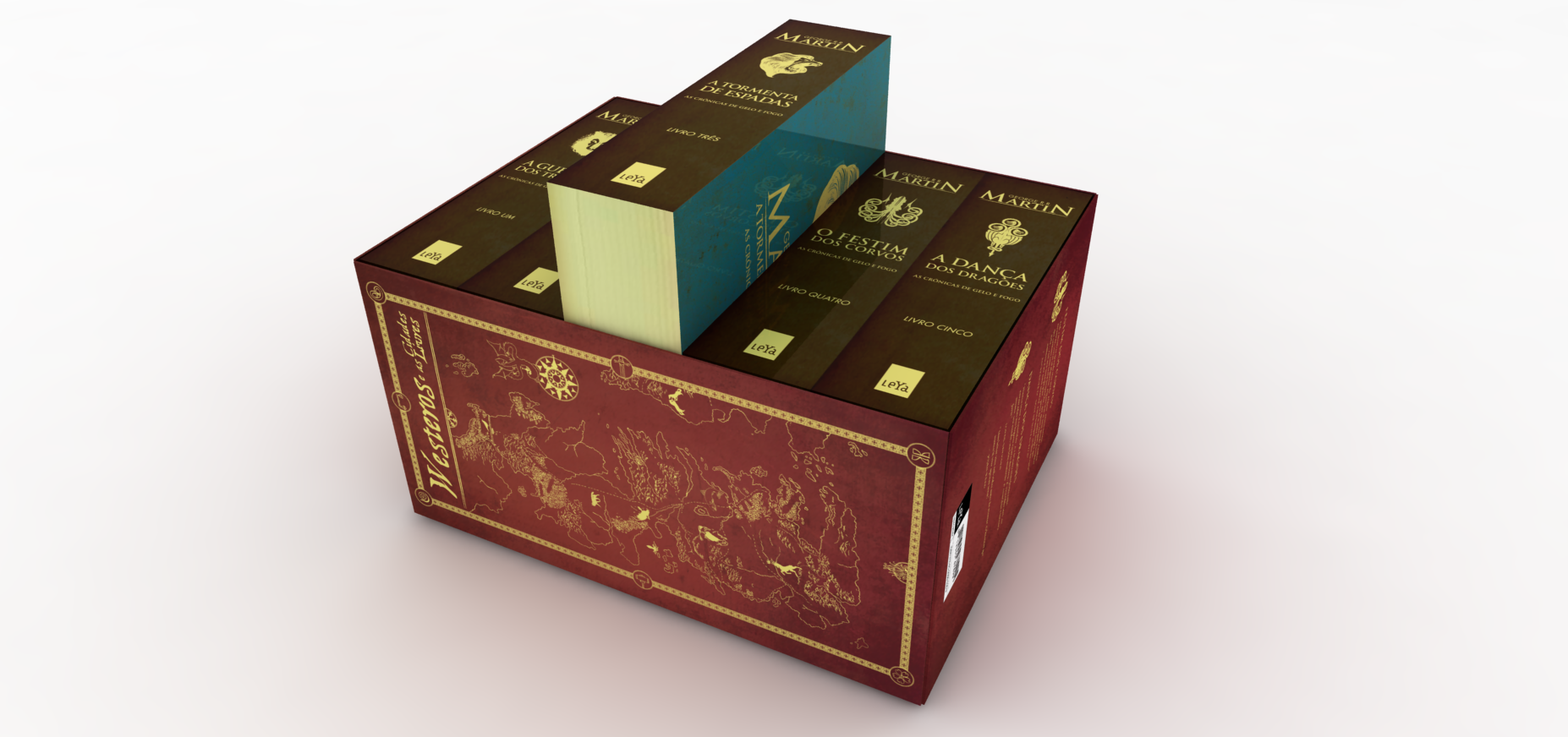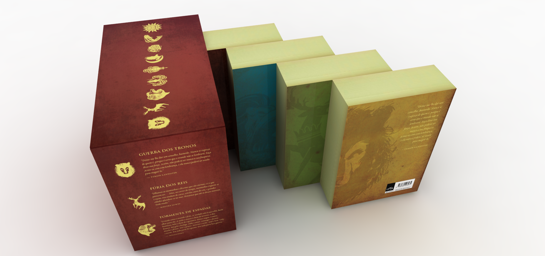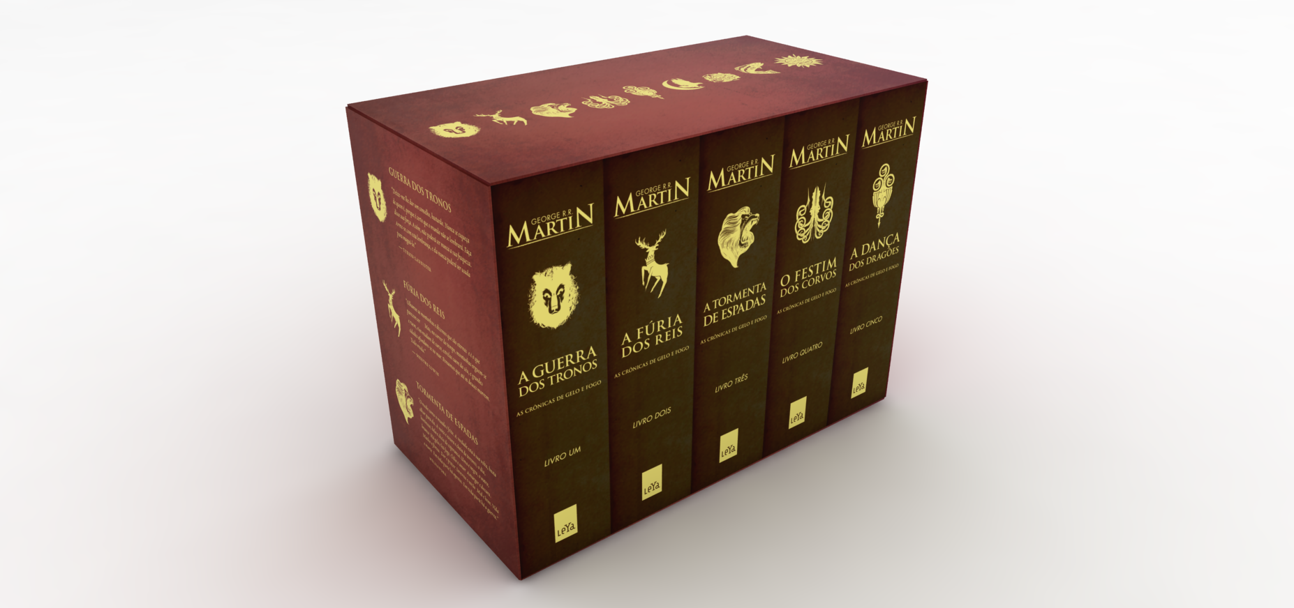 Collector's Box (1st version) with 5 pocket books of the Brazilian edition of "A song of ice and fire", from George R. R. Martin. Graphic design, 3D modeling and rendering. Illustration of the coat of arms: Guilherme Marques.