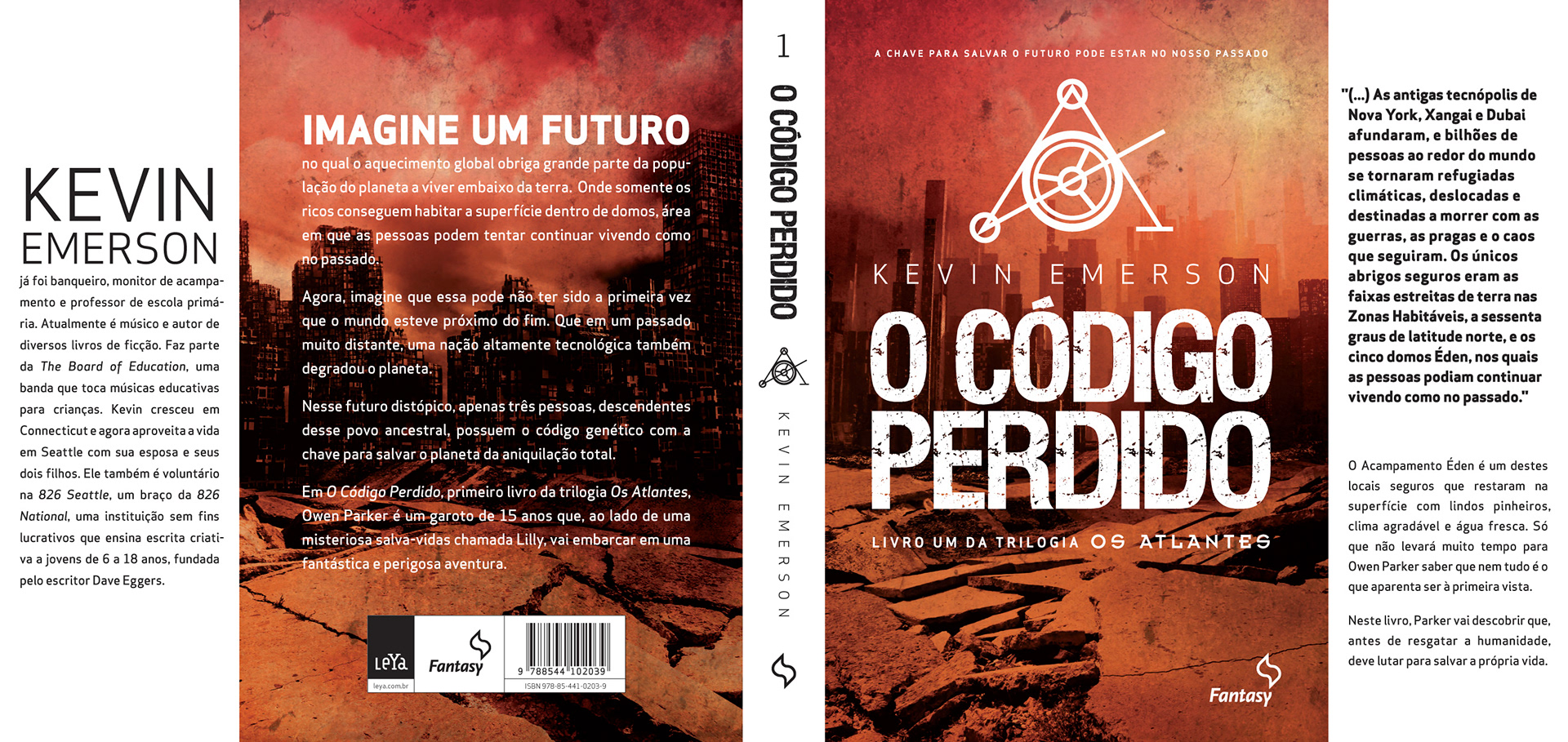 Book cover: "The lost code (The Atlanteans Trilogy - book 1)", Kevin Emerson. Publisher: LeYa, Brazil, 2015. Capa de livro: "O código perdido (Trilogia Os Atlantes - livro 1)", Kevin Emerson. Editora: LeYa, Brasil, 2015.