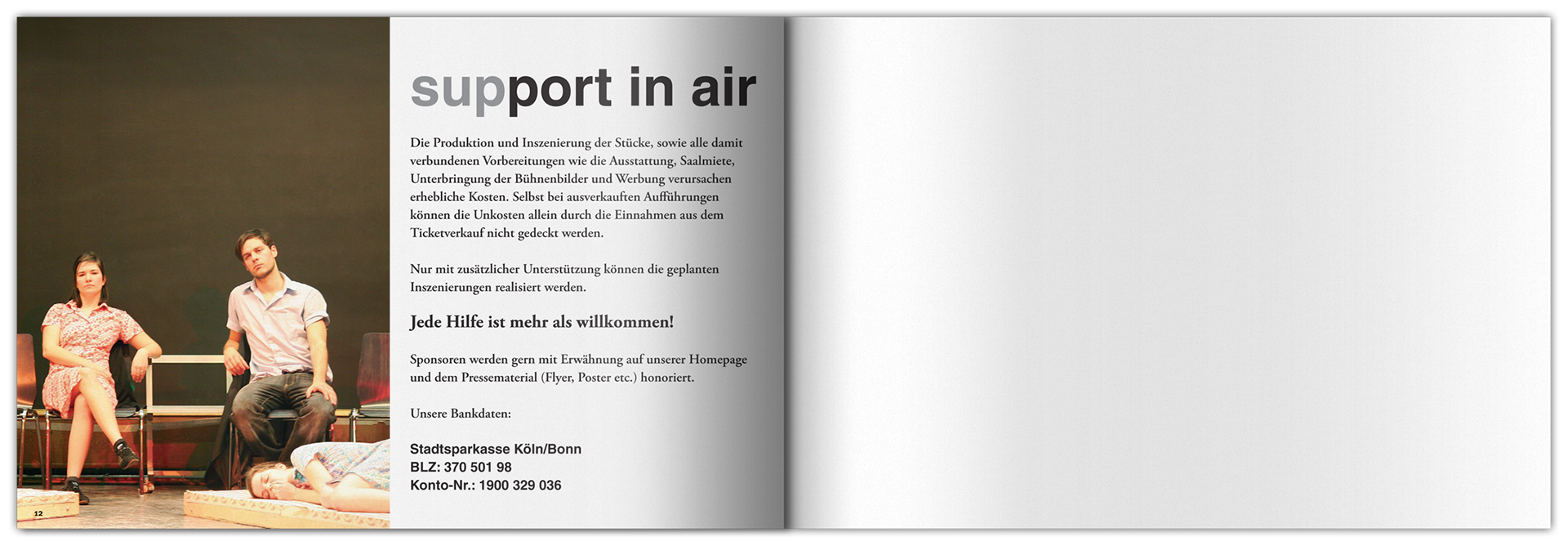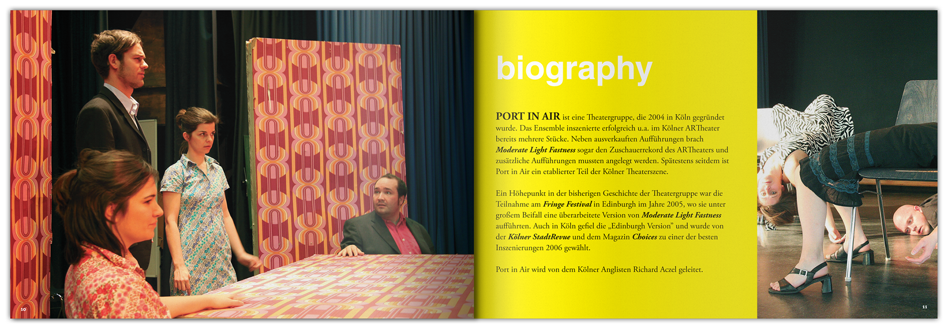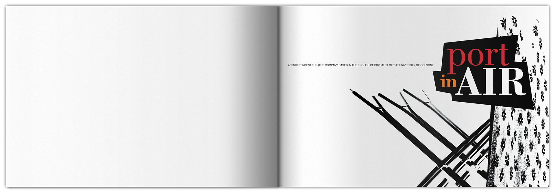 Visual identity for PORT IN AIR, an independent theatre company based in the English Department of the University of Cologne, Germany. Promotional material, DVD, booklet.